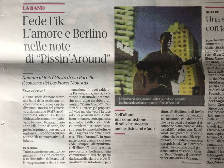 Today Fik performs as a trio with Giulio Daniele (drums and vocals) and Fabio Barbaro (bass), and collaborates in the studio with multi-instrumentalists Amedeo Schiavon and Massimo Zago. There is no shortage of collaborations with wind instruments: there are several in the album Pissin'around, and Federico has also organized numerous marching band parades in Berlin, Padua, and Venice, thus having the opportunity to collect the contacts of many musicians.